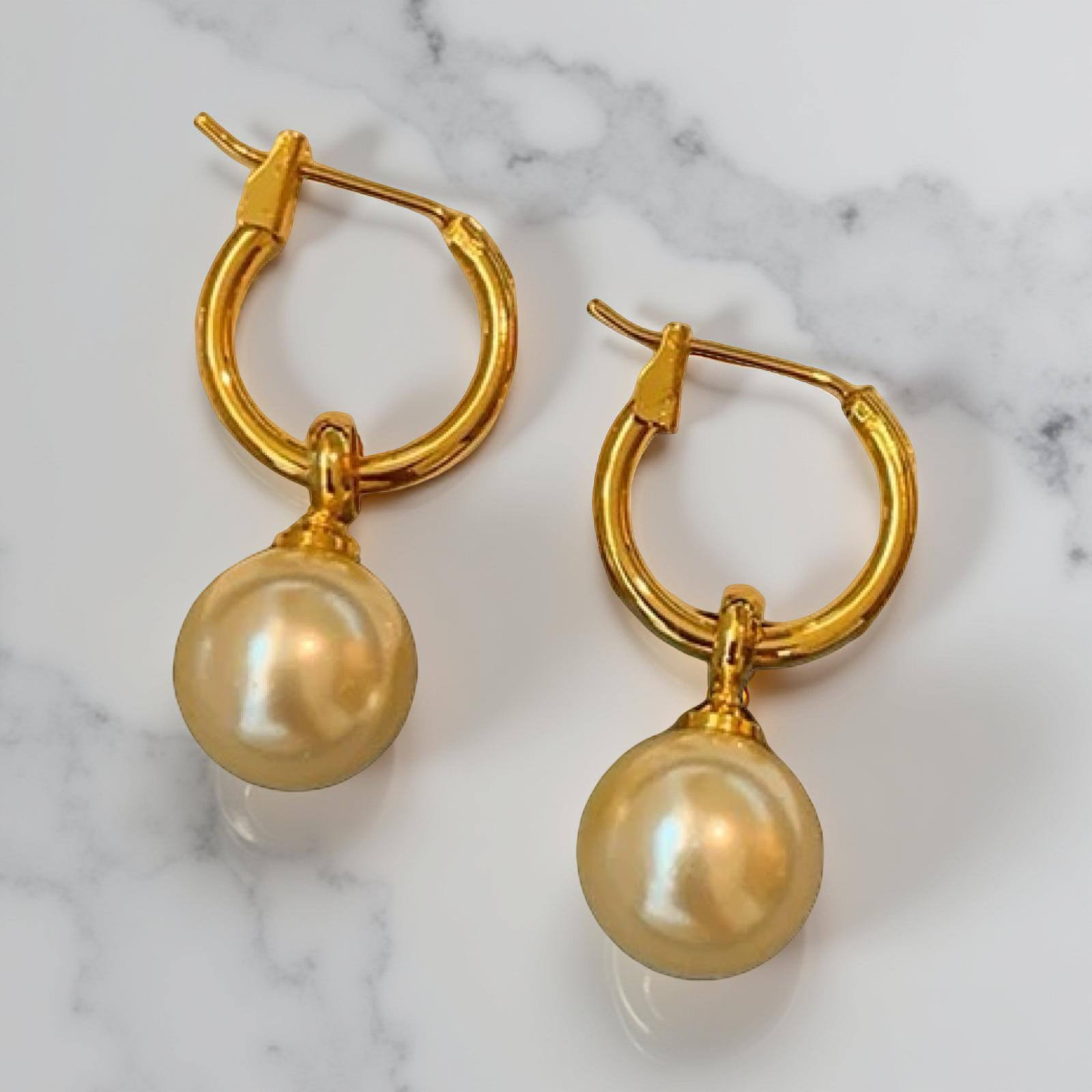 24K Hard Gold or White Gold Plated hoops on a copper base, featuring a smooth pearl drop. 925 sterling silver needles ensure comfort for sensitive ears. A timeless, versatile design that elevates any look with effortless elegance.