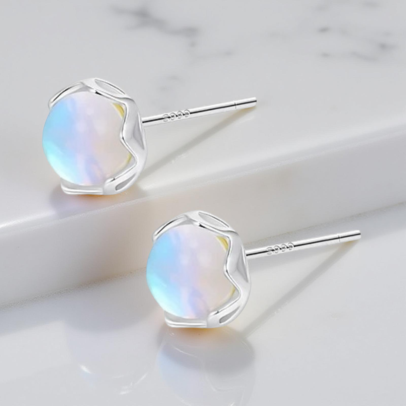 Delicate 999 Silver studs featuring a luminous Luna stone, set to highlight its soft, mystical glow.