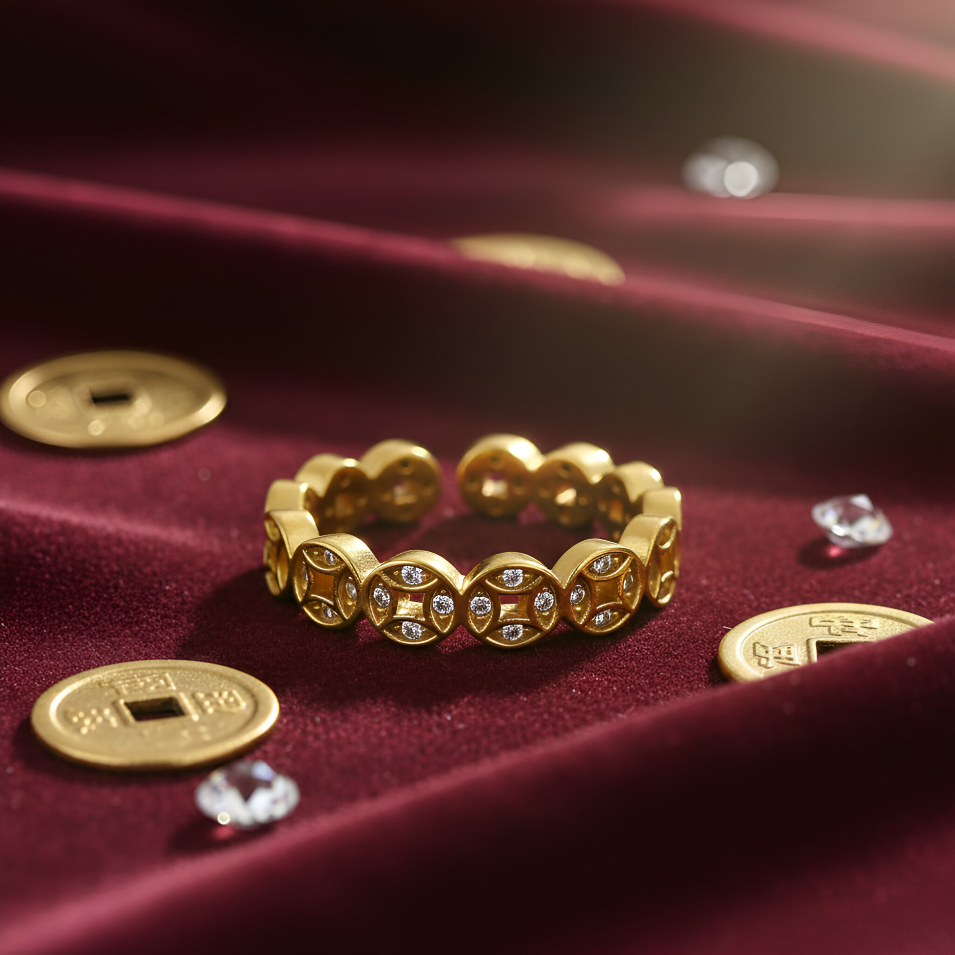 This adjustable open cuff ring features a continuous band of interlocking Chinese copper coin designs (known as Qian or Tong Bao), which symbolize prosperity. Each coin motif is highlighted with a central setting of sparkling cubic zirconia (CZ) stones, adding brilliance and luxury to the auspicious design.