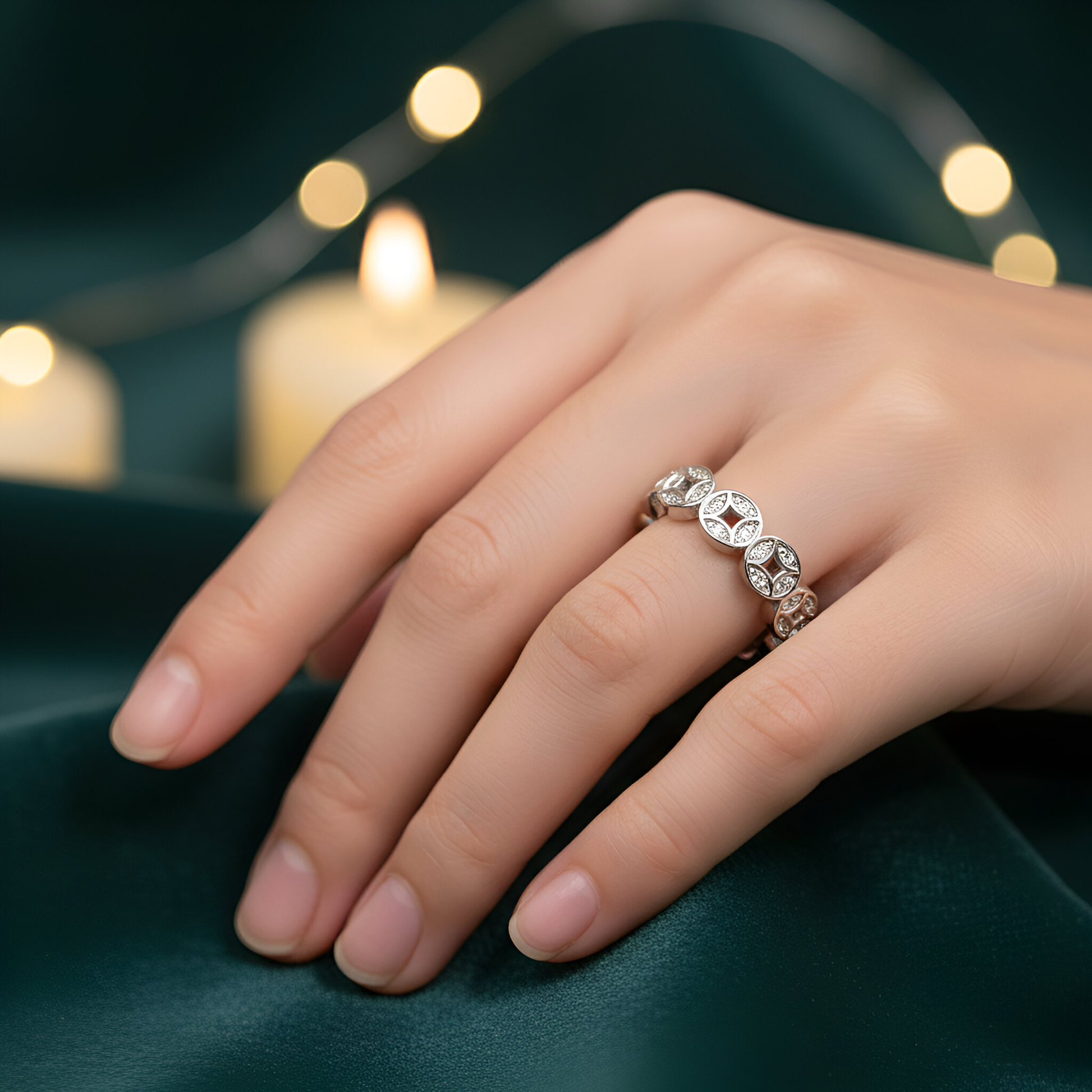 This adjustable open cuff ring features a continuous band of interlocking Chinese copper coin designs (known as Qian or Tong Bao), which symbolize prosperity. Each coin motif is highlighted with a central setting of sparkling cubic zirconia (CZ) stones, adding brilliance and luxury to the auspicious design.