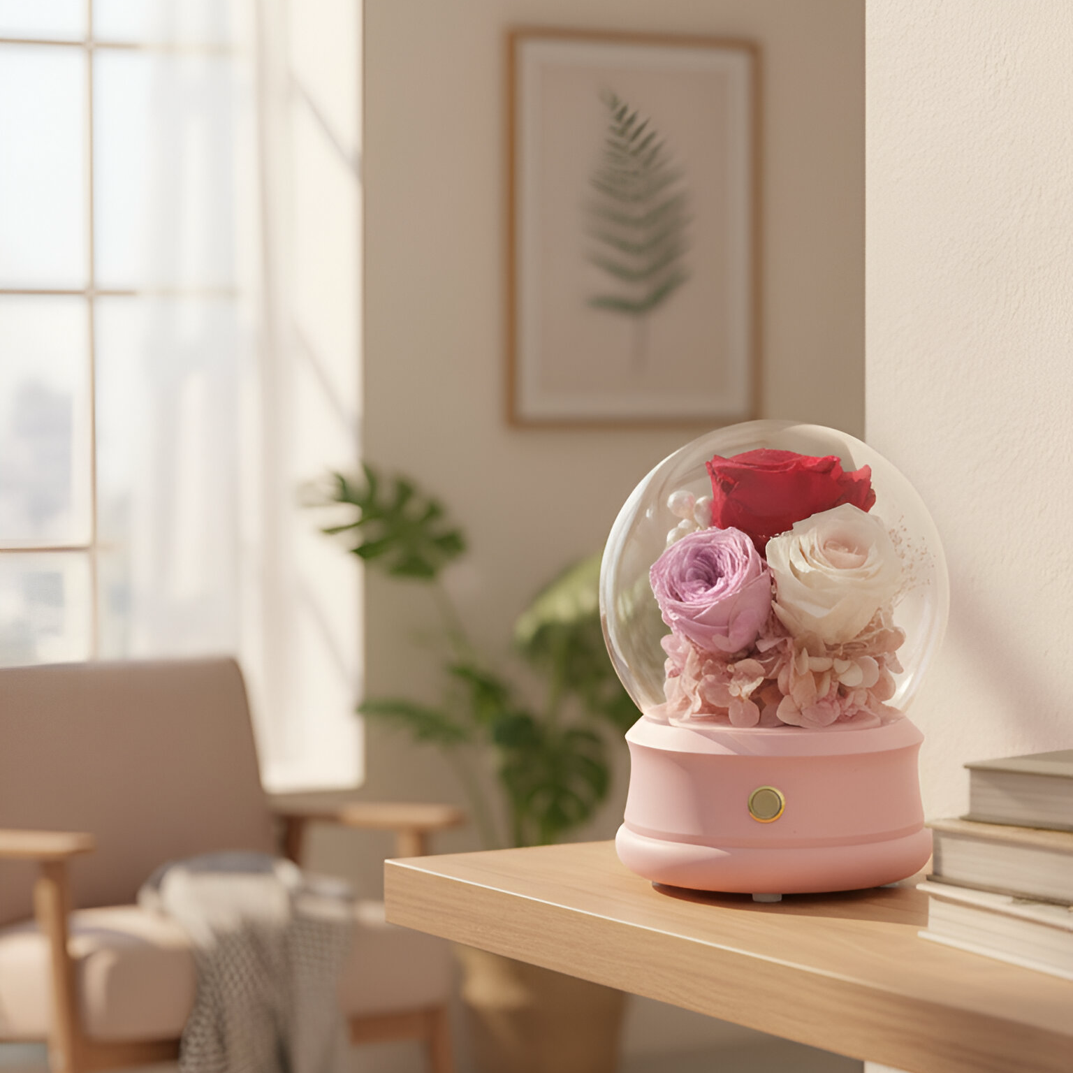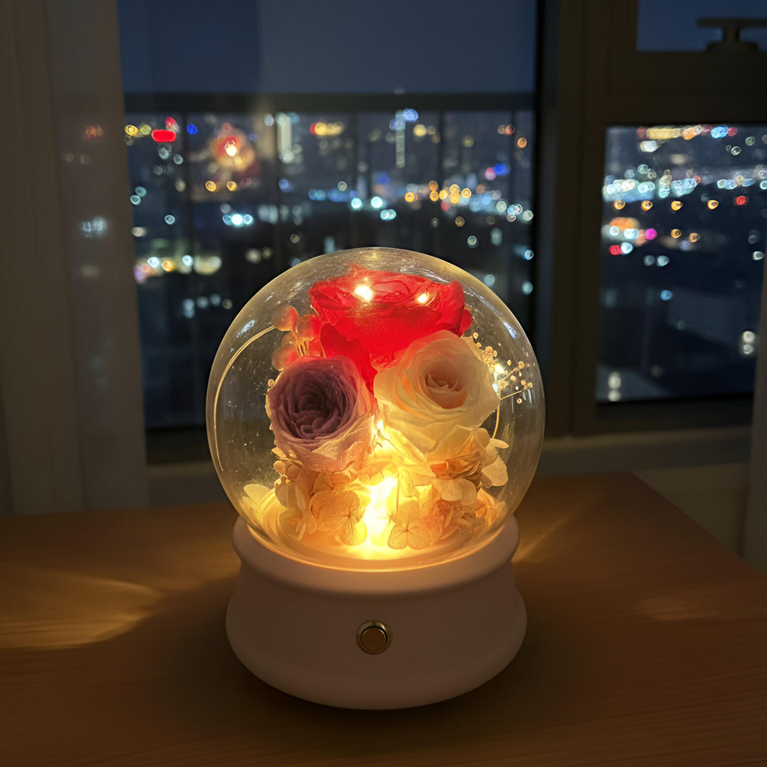 This beautiful globe captures the spirit of admiration, happiness, and celebration, featuring colorful Japanese preserved roses with a Hot Pink Rose centerpiece. Functions as both an ambient light with fairy lights and a powerful Bluetooth speaker.