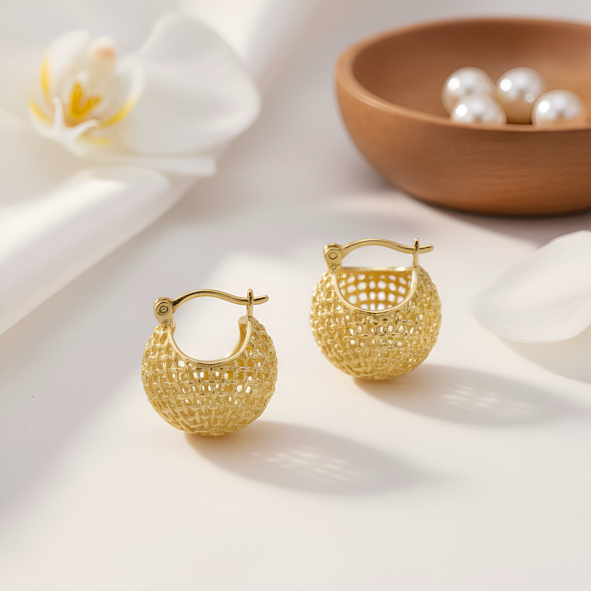 These are small, dome-shaped huggie hoops featuring a delicate lattice or mesh pattern, giving them an airy, lightweight appearance and a captivating texture. The detailed openwork design allows light to pass through, enhancing their radiant glow.