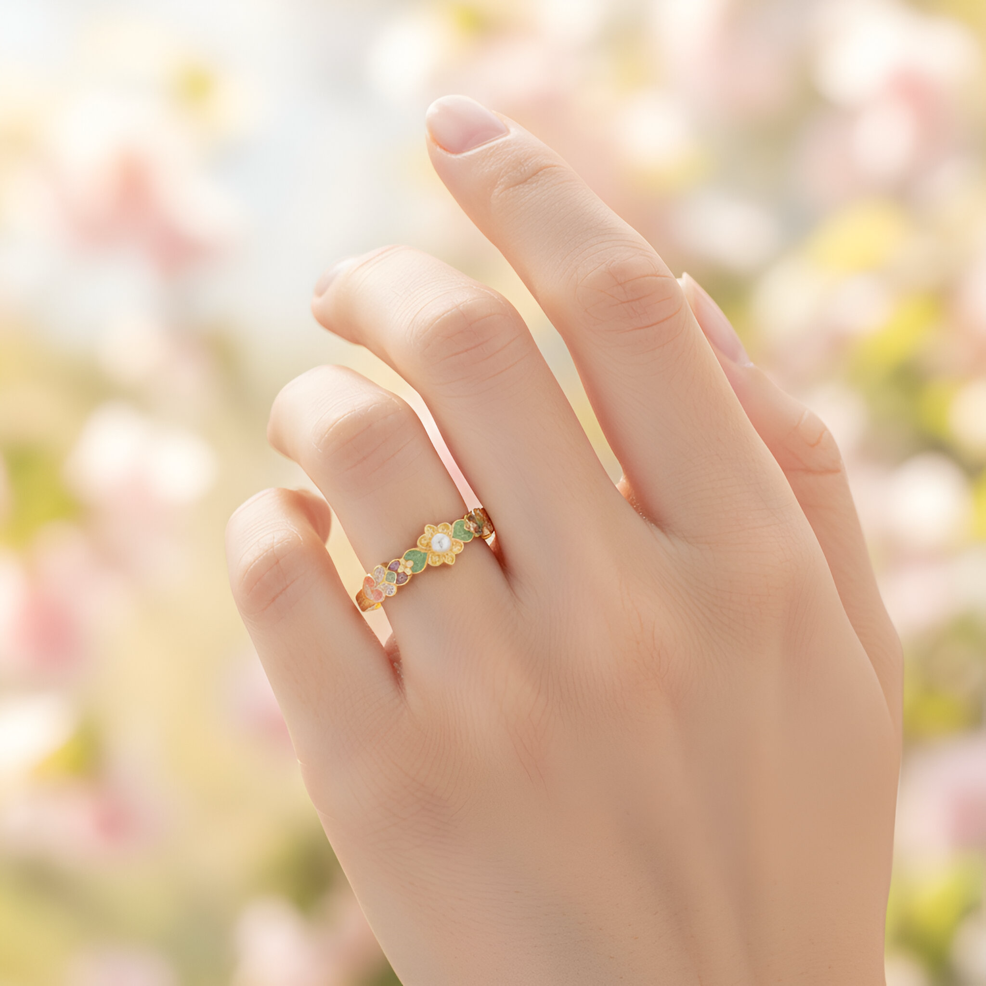 Crafted from high-quality S925 Sterling Silver for durability and shine. The ring is finished with a luxurious 18K Gold Vermeil, providing a rich golden color that beautifully frames the colorful enamel work. The floral centers include small accents (like the white pearl-like bead seen on the band) to enhance the delicate design.