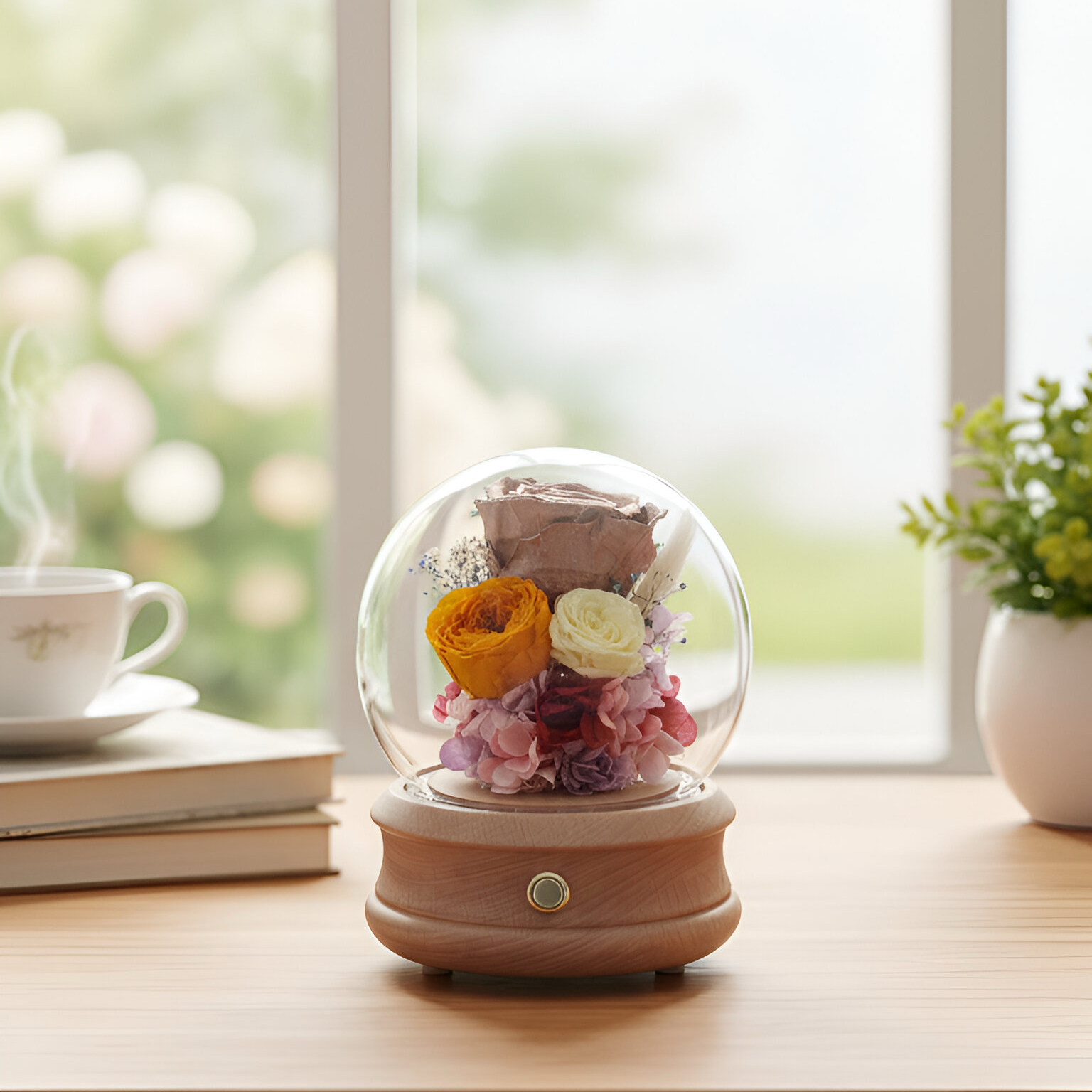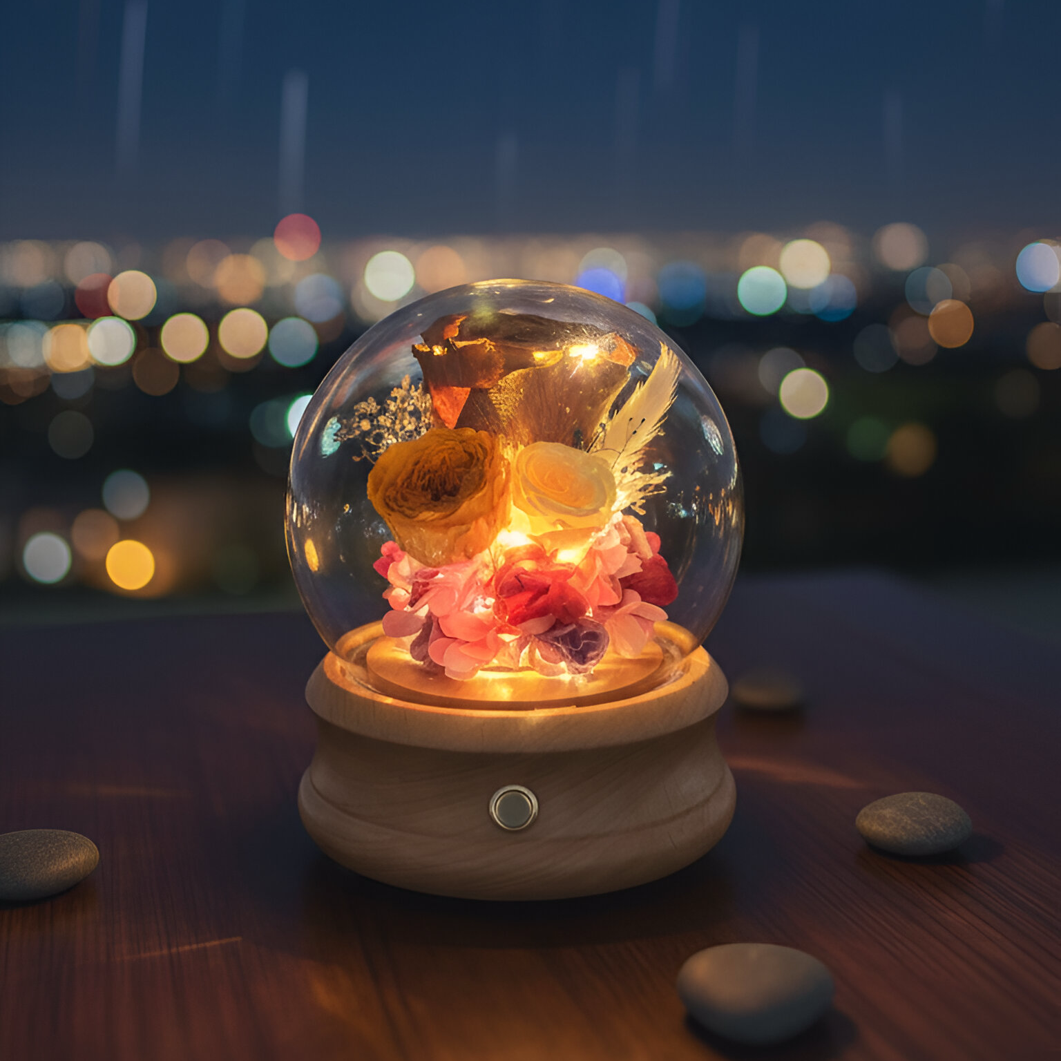 Handmade design features a rare Copper Rose, symbolizing unique charm and enduring warmth, surrounded by Japanese preserved flowers. It includes delicate fairy lights and a Bluetooth speaker.
