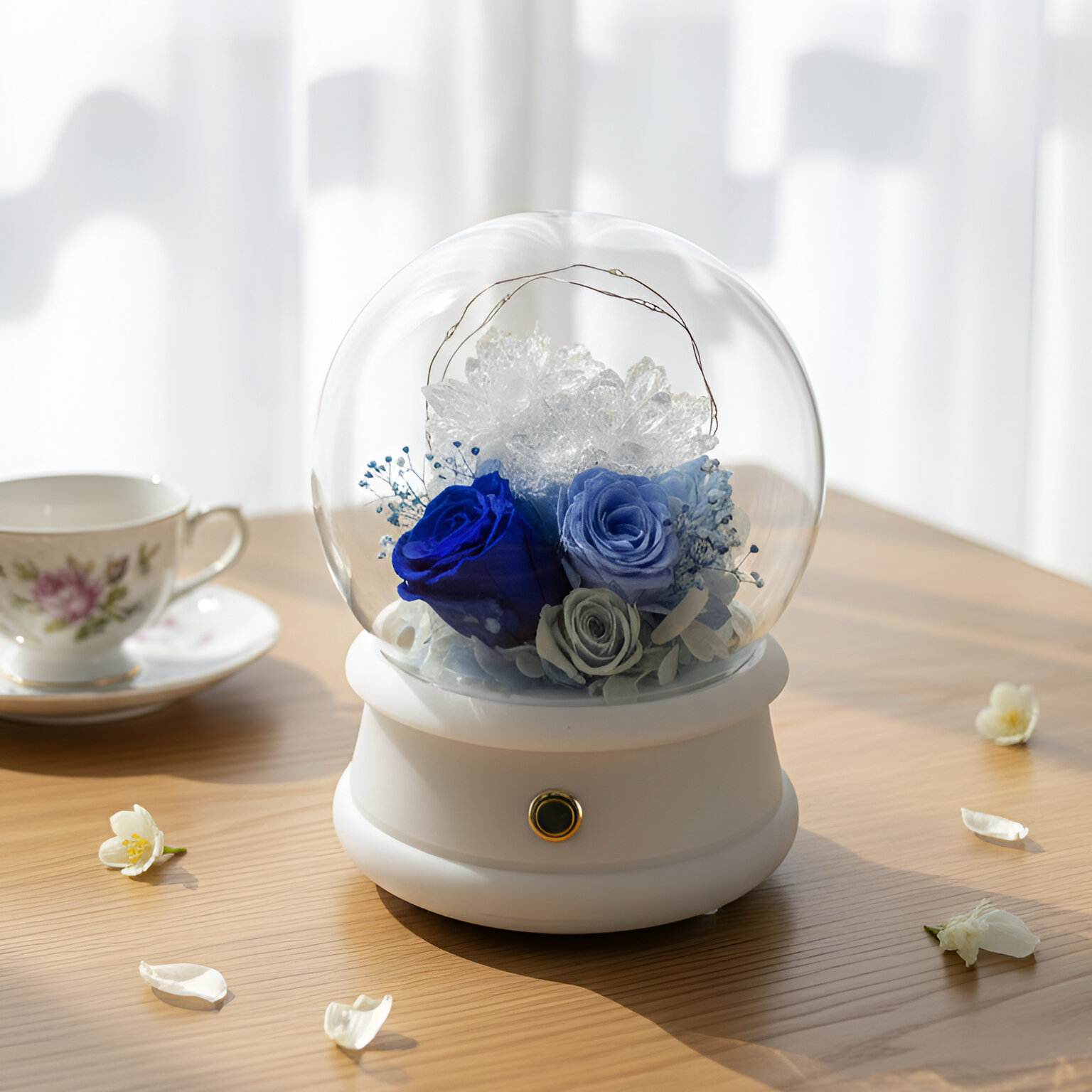 Soft blue and grey preserved blooms embrace the purifying White Quartz, echoing the calm of a light wind. A graceful blend of light, music, and handcrafted floral art.